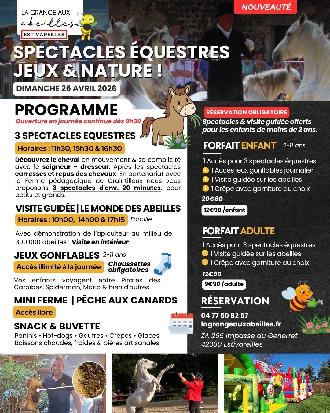 Venez découvrir le cheval en mouvement et sa complicité avec le soigneur-dresseur. Après les spectacles, place aux caresses et repas des chevaux. Profitez des visites guidées sur le monde des abeilles, jeux gonflables (2/11 ans), mini-ferme et du snack.
