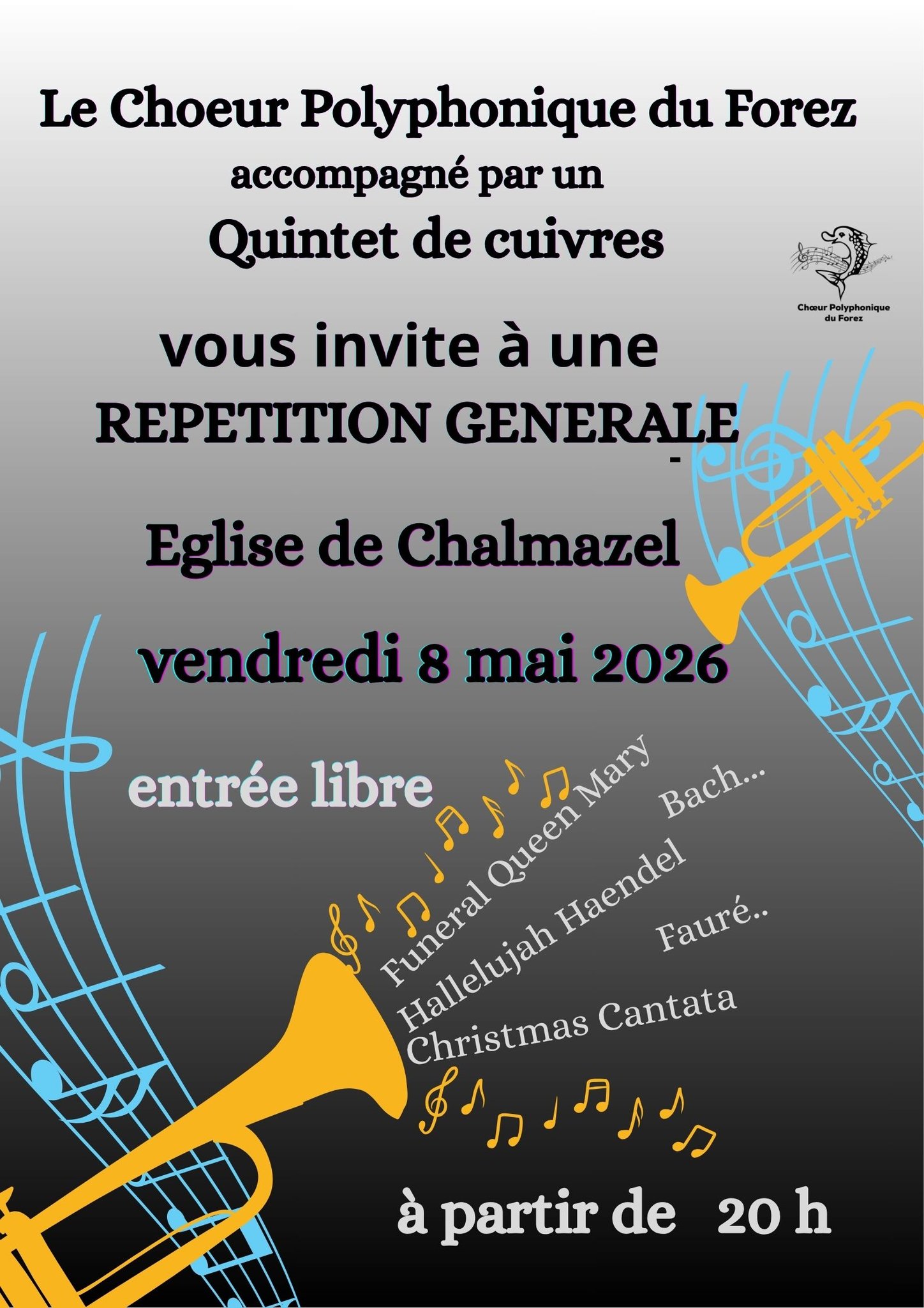Avant les 2 concerts du Chœur Polyphonique du Forez à Champdieu et à Noirétable, une répétition publique vous est proposée pour découvrir un programme autour de magnifiques œuvres de Bach, Purcell,... accompagnées par un quintet de cuivre !