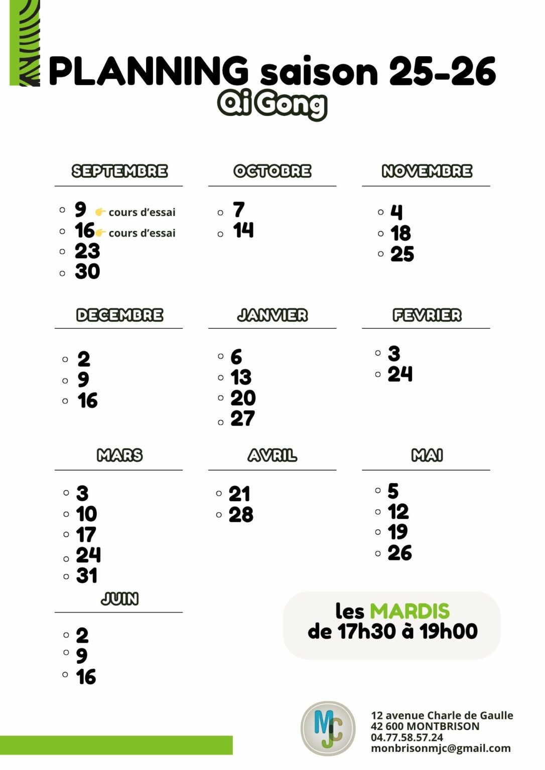 Du 09/09 au 16/06 le mardi de 17h30 à 19h.