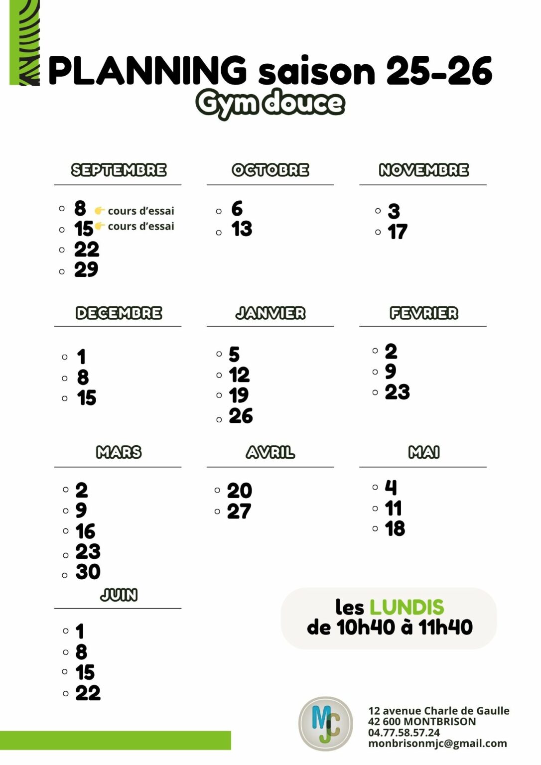 Du 08/09/2025 au 22/06/2026 le lundi de 10h40 à 11h40.