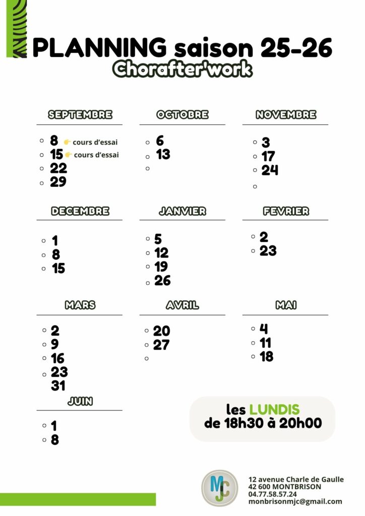Du 08/09 au 08/06 le lundi de 18h30 à 20h.