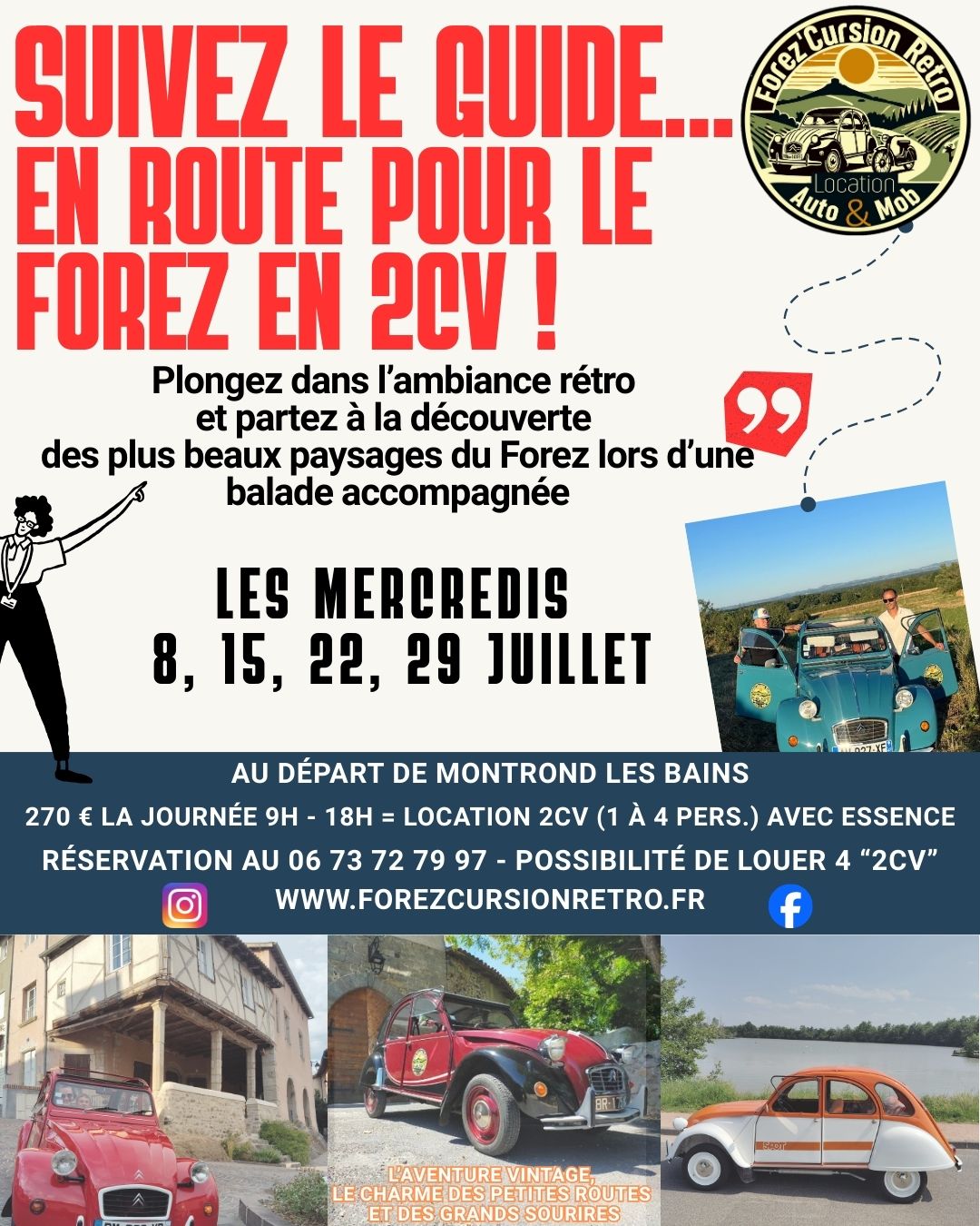 Le moteur ronronne, la capote est ouverte...Bienvenue dans le Forez, vu depuis une 2CV. Au fil des routes et des histoires racontées par votre guide, découvrez un territoire authentique, naturel et plein de surprises.