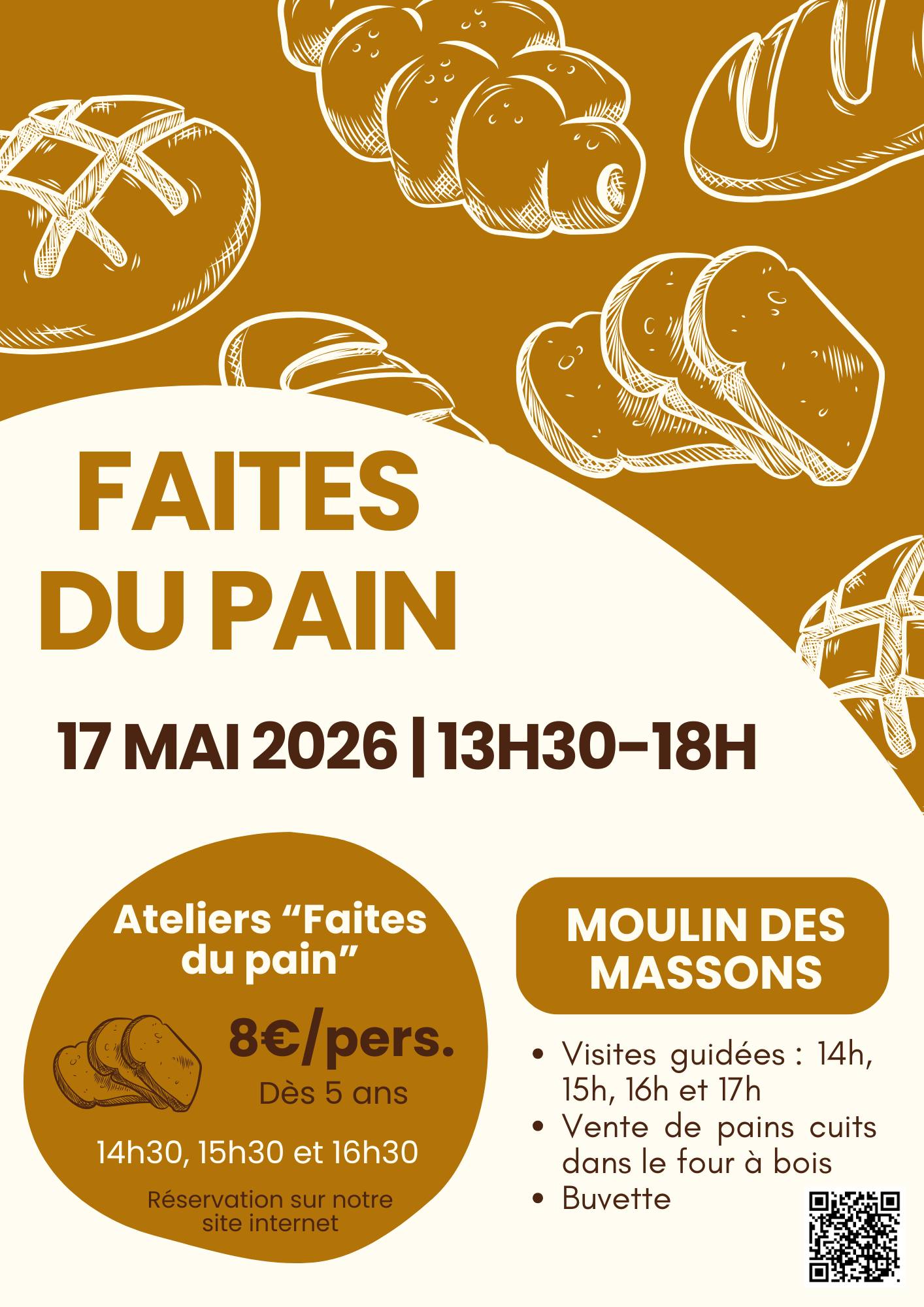Au programme : fournées de pain dans le four à bois, visites guidées à 14h, 15h, 16h et 17h, et ateliers «Faites du pain» pour petits et grands à 14h30, 15h30 et 16h30 sur réservation.