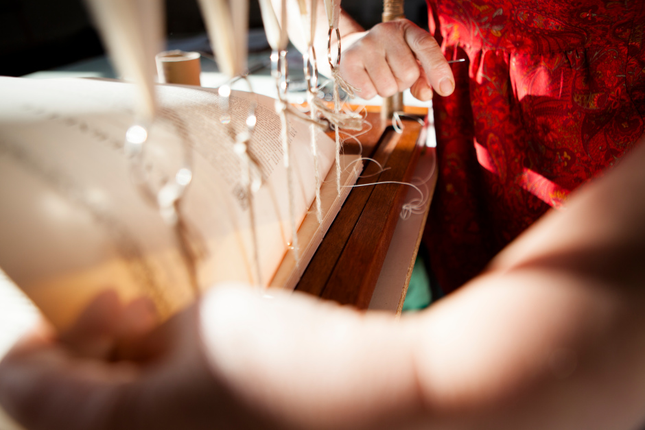 Technique dite « à la française », la reliure cousue exige patience et précision pour restaurer des ouvrages anciens.